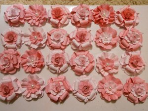 Wow did I have my work cut out for me. My treasure chest kits came with 3 handmade flowers and it took most of the day to make these beautiful flowers!! Good news is they all sold and I have them all packed up and ready to go out. I will be making more chest kits but a little different! I do love these handmade flowers and will do a tutorial on them!! So my whole online scrap family can make them too!!