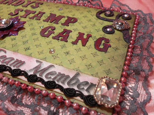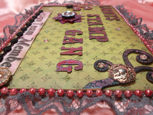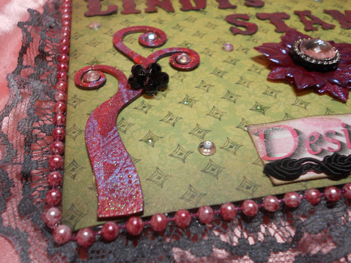 First I chose a DCWV Designer paper and then distressed it with Walnut stain ink. Then I painted the fabulous filagree with a mixture of elmers clear glue & Ramblin Rose pink magical mica’s. I also stamped an image with perfect medium and buffed in some Screamin Banshee Black Magical Mica’s.