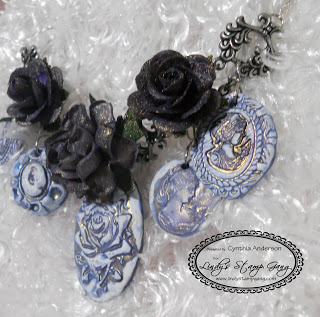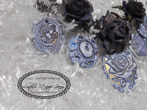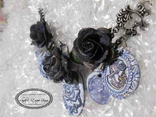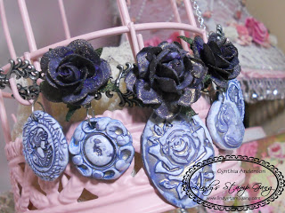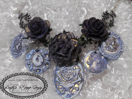 I started out with some Fimo molds. I sprayed the molds with Lindy’s Stamp Gang Voodoo Violet Blue Starburst Spray before I baked it. I also added holes to the top to use them on a necklace. I then baked the molds for 30 minutes @ 230 degrees. I used S links to attach them to a filigree bracelet. I added some silver chain and made a clasp from 20 gauge silver plated wire. I then added some IAmRoses sprayed with the Voodoo Violet Blue as a beautiful accent. For a more detailed look click here to view a video!
