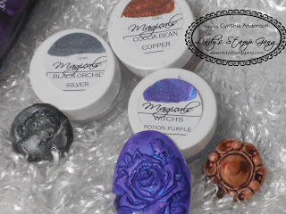 Another technique can also be used by painting the unbaked molds with magical mica’s as I did here. I used Witch’s Potion Purple, Cocoa Bean Copper, and Black Orchid Silver Magical Mica’s.