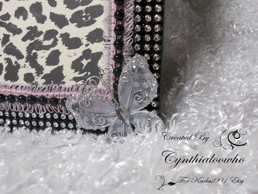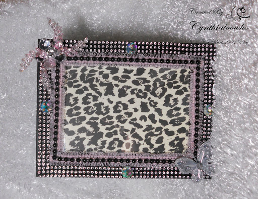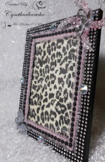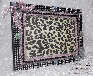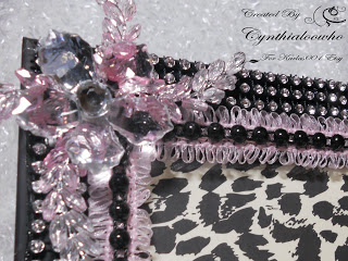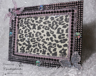 Here is a photo frame I altered for a swap on A Lil Scrap of Heaven, I used products from Karlas001 and had so much fun making this. I started out with a plain wooden frame, painted it with black gesso. Then I added Blingy Looking Black Mesh, then added Loopy Pink Trim. I also added some Black Flat Black Pearls, a Medium Size Silver Butterfly, some Wheat Pink Spray/Leaves, and finished it off with some beautiful Iridescent Bling Embellishments.