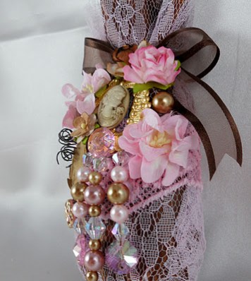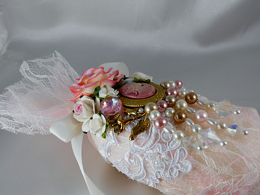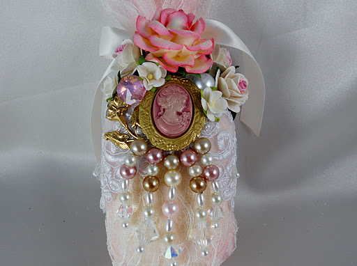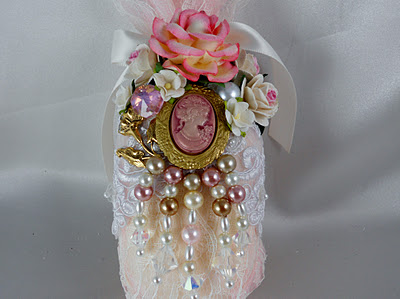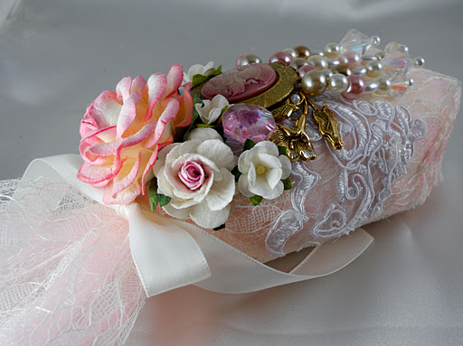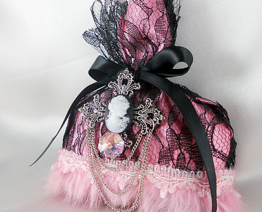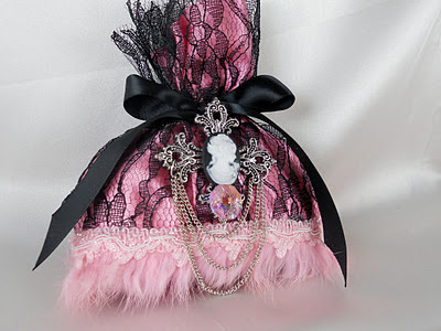 I used some lush pink satin and black flat lace to cover the soap. I then added a beautiful embellishment with a cameo (I added) to the front and some gorgeous Fancy Feather Trim from Karlas001.