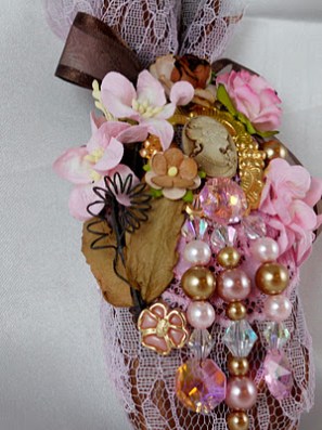 I also used a beautiful brass frame “Funky Frame” charm from Lindy’s Stamp Gang. I added a beautiful cameo to the charm and then embellished flowers, pearls, crystals, and I strung some pearls and crystals to hang from the charm.