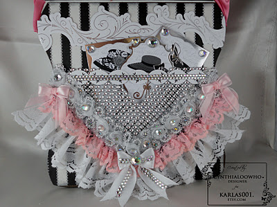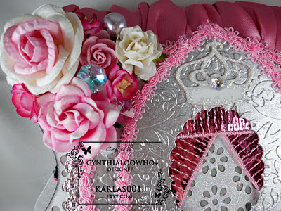 On the front cover I embossed the carriage and painted it with silver metal mixatives. I used a lot of bling and fabrics as well as I Am Roses! I edged the carriage and wheels with some beautiful Silver Medium Flower trim too.