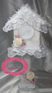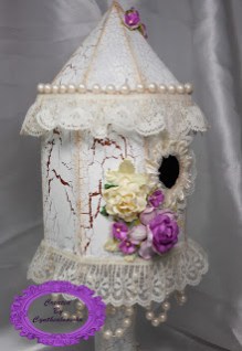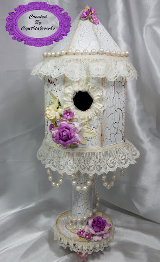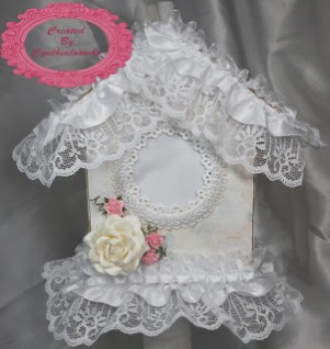 I made there birdhouses from chipboard, paint, lace, trim, and flowers.