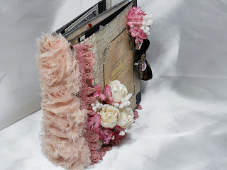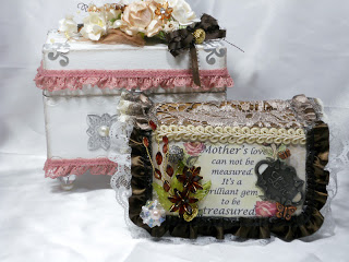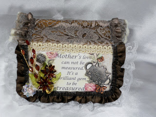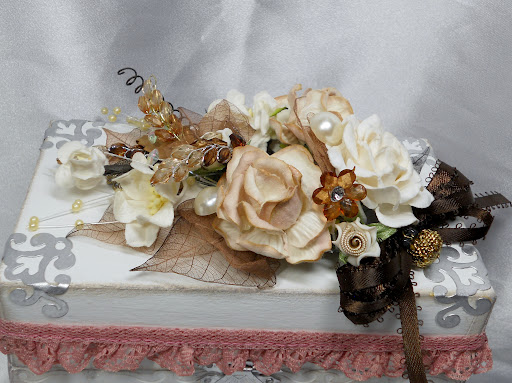 I created this box with heavy weight chipboard and it has a flip top lid like a cigar box. I then crackle painted it and sealed with Matte Mod Podge, white paint, and Scintillating Silver Magical Mica & embellished.