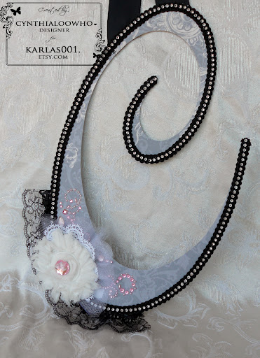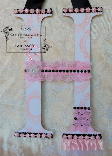 This was a very fun project and one I’ve planned since I found out my grand daughter is a girl! The letters are from a chipboard letter set. I used the Teresa Collins “Timeless” collection. I used some beautiful embellishments from KARLAS001’s etsy.