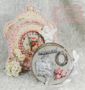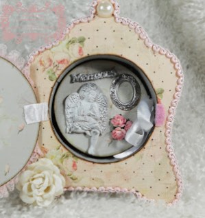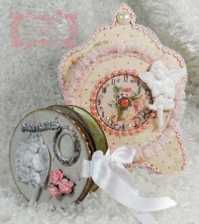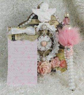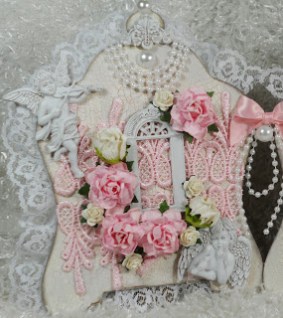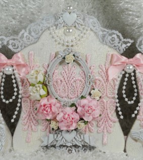 I crackle painted all the dies, and used some beautiful Venice lace from The Lace Mama on ebay, I added a lot of Prima’s Shabby Chic Treasures resins, some pearl strands, flat back pearls from SACrafter’s Zibbet store, R-21, R8-15, BP/T 25 – 152’s from I Am Roses, & Royal Crimson Fire Glitz Spritz from Lindy’s Stamp Gang.