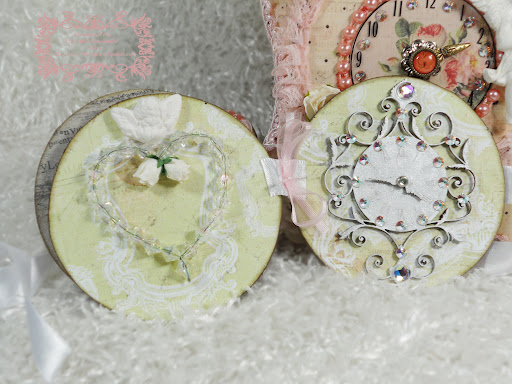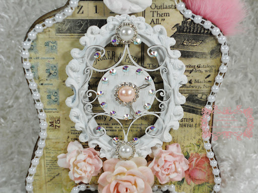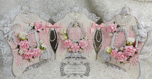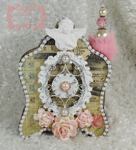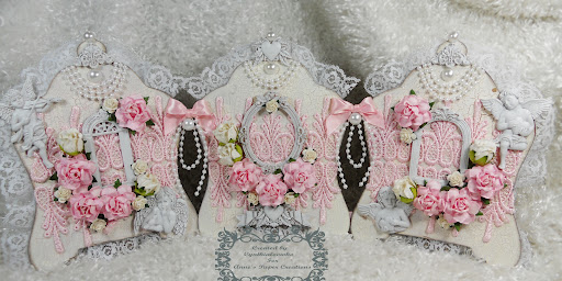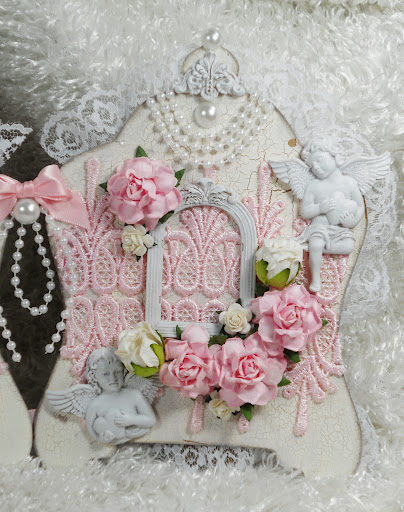 I crackle painted all the dies, and used some beautiful Venice lace from The Lace Mama on ebay, I added a lot of Prima’s Shabby Chic Treasures resins, some pearl strands, flat back pearls from SACrafter’s Zibbet store, R-21, R8-15, BP/T 25 – 152’s from I Am Roses, & Royal Crimson Fire Glitz Spritz from Lindy’s Stamp Gang.