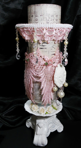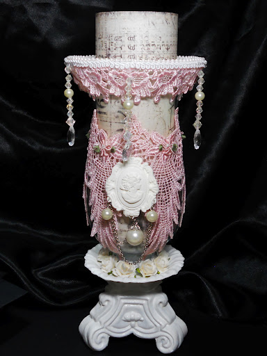 I used some beautiful lace from Delightful Designer & The Lace Mama. I also used some I Am Roses, a cameo, pearls, fancy trim, faceted beads, acrylic paint, sealer, E6000, & hot glue.