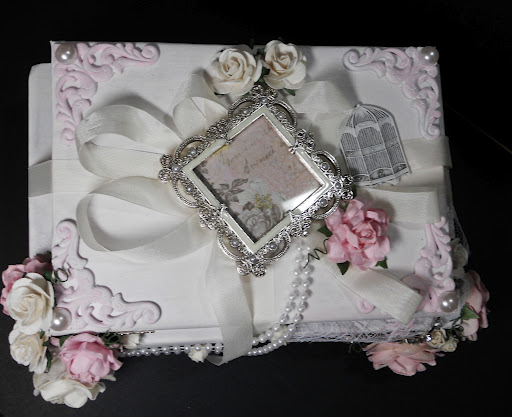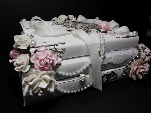 I found 3 books that were the perfect size, painted them white, then added misc. embellishments. Fast & easy 🙂