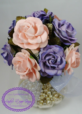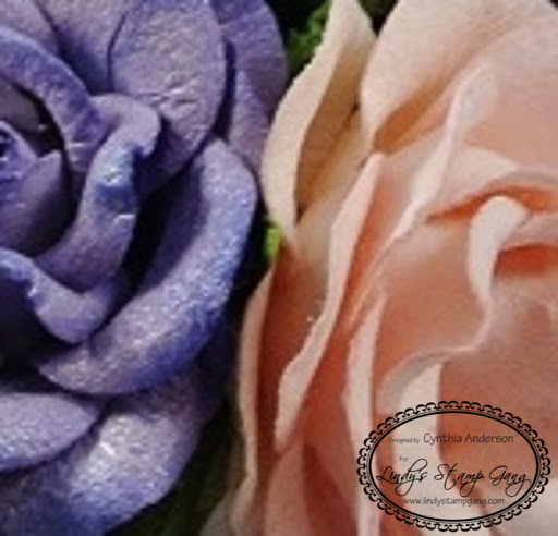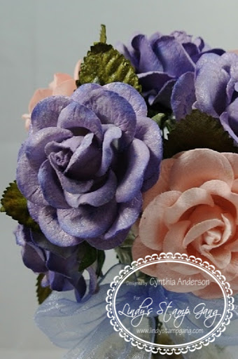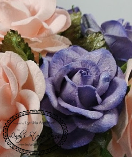 I made a flower arrangement for my desk. I colored the soft pink roses with my very favorite Lindy’s Stamp Gang Starburst spray Salt Water Taffy, For the purple roses I used the brand new Teapot Purple from the New Mad Hatter set. It’s a beautiful purple. I wanted to tone it it down a little on the edges so I sprayed a light mist of my 2nd favorite Lindy’s Stamp Gang Starburst Frozen Jack Frost which is also available in the Winter Wonderland set. I then sprayed all the leaves with the deep rich Green With Envy Green Starburst spray.