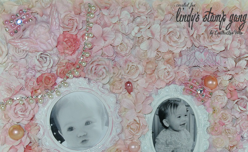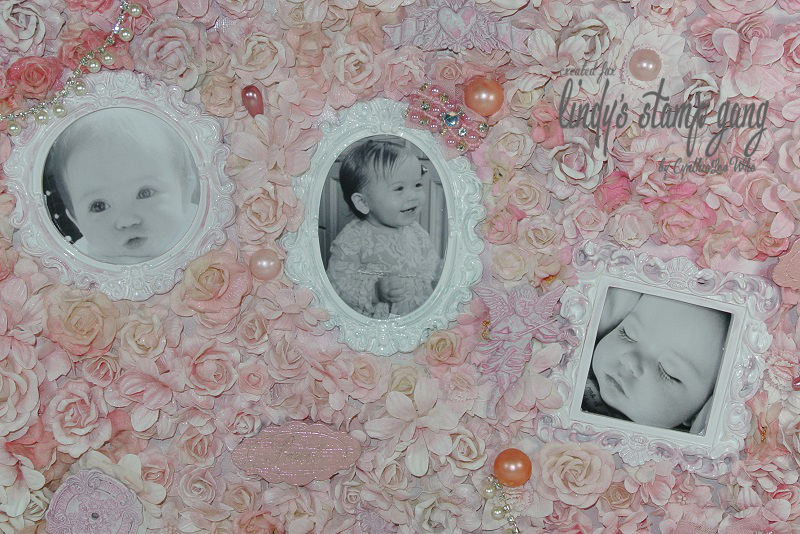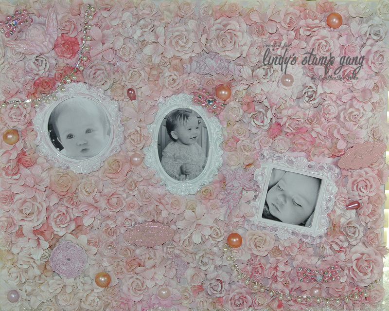 I created a canvas covered in I Am Roses and embellishments! I once I was finished adding the flowers I sprayed randomly with all the pinks! I also used the 2 toned embossing powders on pearls and embellishments. I chose 3 photos of Monkey “Chloe” my grand daughter. One at 4 months old, 8 months and 1 year. This canvas measures 16″x20″ and will be displayed in my Foyer! If you love pink you MUST get “Pink October” you will absolutely love it! I have a fast play video of me making this canvas I will post at the bottom. Here are some photos.