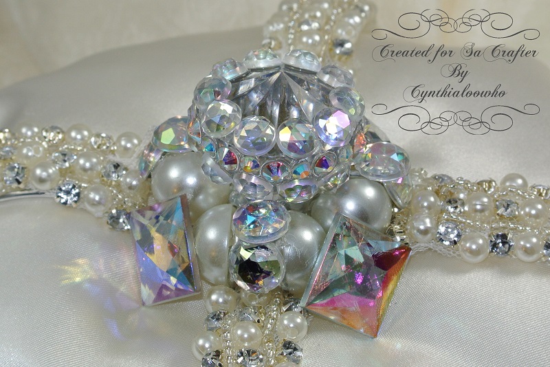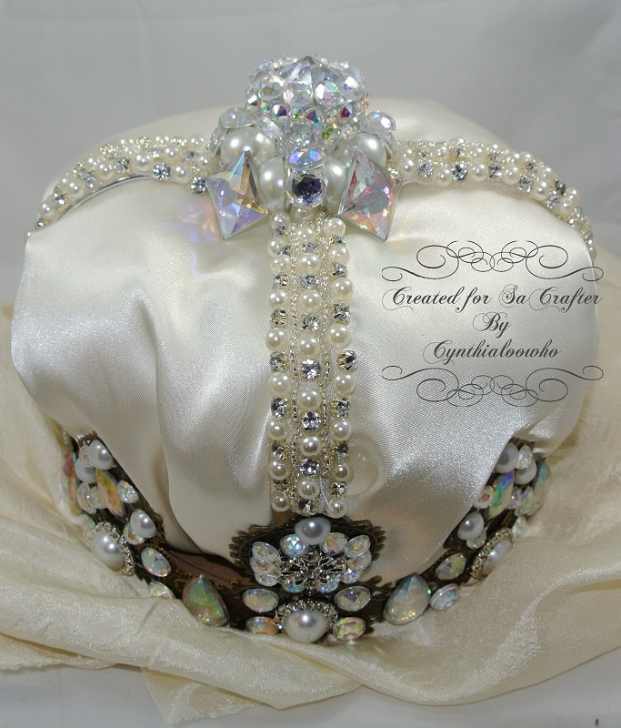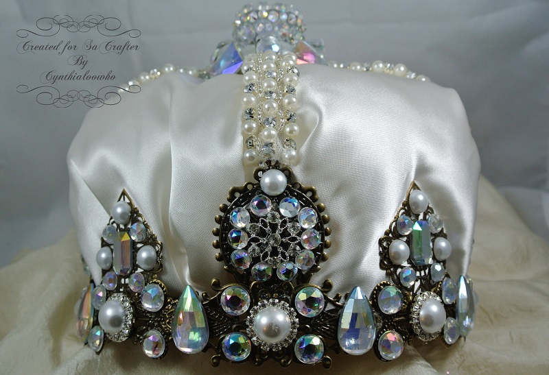 I had so much fun making these! Â I was looking for Halloween costumes online and I seen a crown and it hit me, SaCrafters filigress would be perfect for a crown. I started to picture how to make it then I got to excited and just started making it. The base of the crown is made entirely of filigrees then embellished. I also used some beautiful trims. I then took a 18″x18″ piece of satin and did a very loose running stitch, filled it with stuffing and pulled tight, and knotted it. I put that inside the crown and cut a piece of chipboard to push up inside the crown to hold the stuffing in. It was actually a quick project.