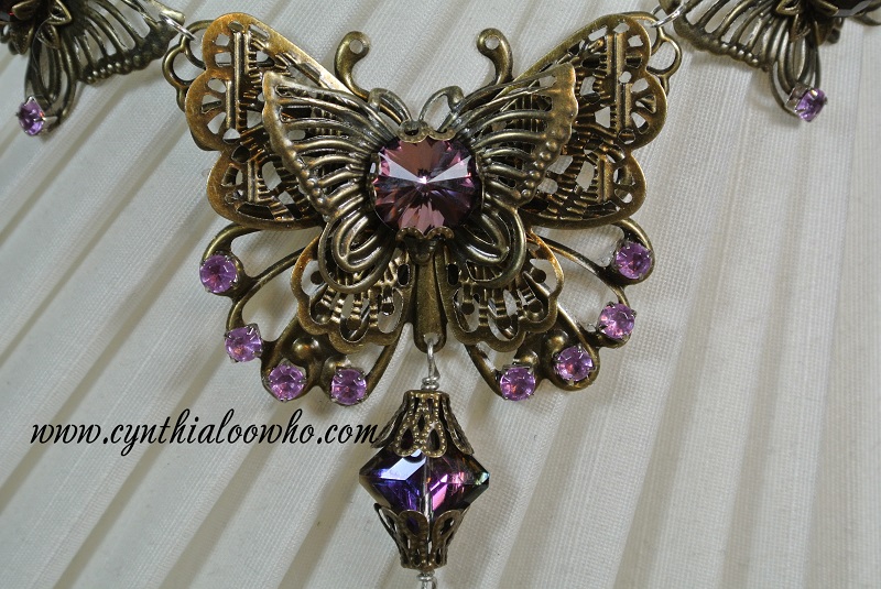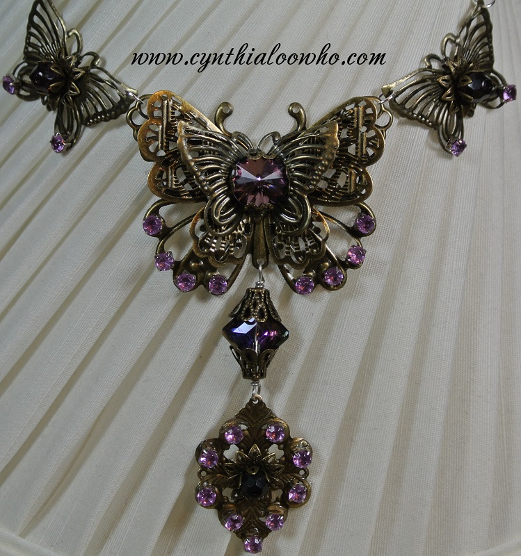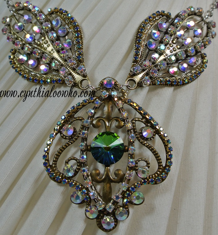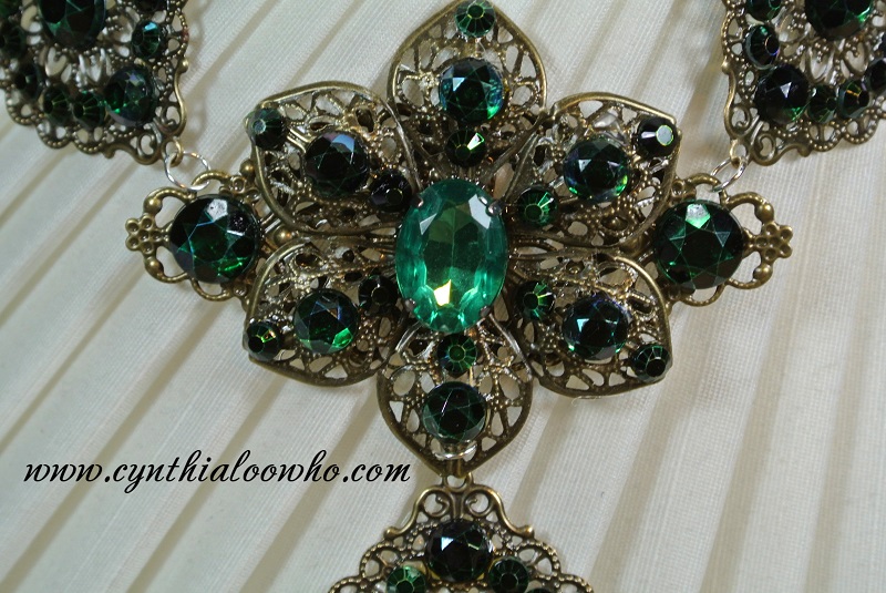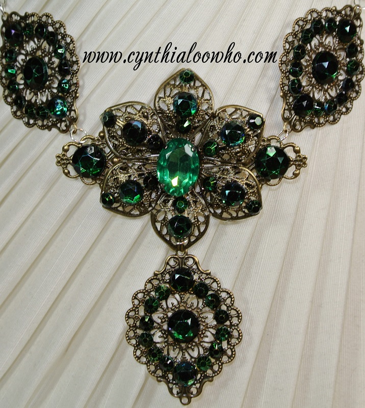 I would like to share some necklaces I made for when I want to feel a little fancy 🙂 I made these from bronze, silver, and pewter colored filigrees. I used alcohol inks to color the rhinestones on the green one. I also used rhinestone chain and misc bling. I adhered everything with E6000 adhesive.
