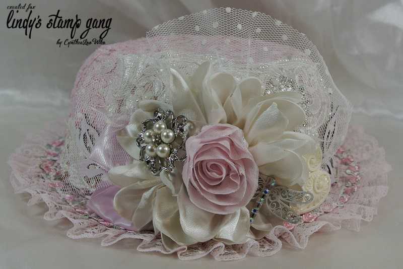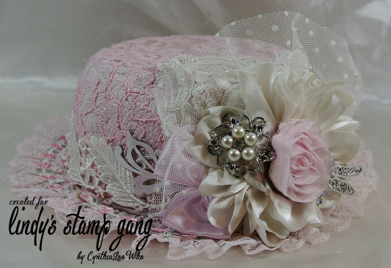 Now comes the fun part “Embellishing” I painted all the chip pieces with white paint and sprayed with Salt Water Taffy Starburst spray and added them to the hat along with a handmade satin flower, brooches, laces, and bling.