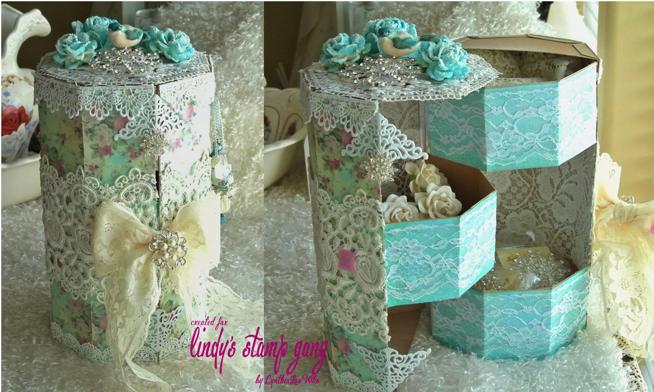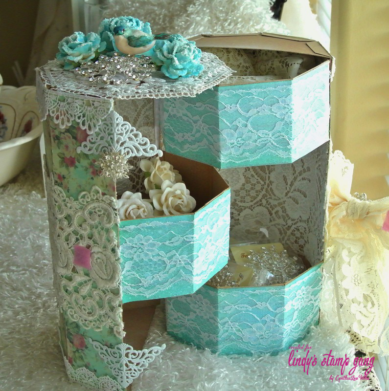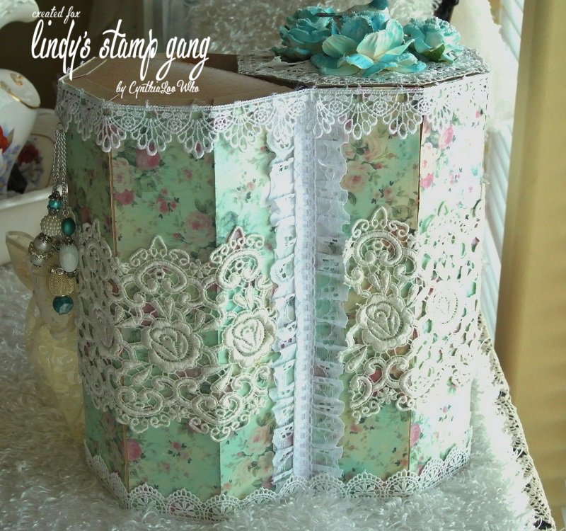 I made an octagon box with 3 compartments to store my filigrees. I have a lot!!!! I wanted something pretty but could take some abuse because I will be using it a lot. I used .22 weight (light) chipboard to construct the box and compartments and covered the outside and compartments with paper I colored with Lindy’s Stamp Gang’s Time Travel Teal Starburst spray and then I lightened it a bit with Frozen Jack Frost Starburst. Once I finished the construction I got to decorate (my favorite part) I added a big lace bow for the closure. I used velcro on the bow to close it, I thought that would be easy to open and close with one hand. I added some gorgeous wide white lace from Tresors De Luxe. I made a charm with some color coordinating beads, crystals, and chain. Then for the top I used some beautiful I Am Roses, roses and colored them with Time Travel Teal, Frozen Jack Frost and then sprinkled them with Diamond dust with some acrylic paint for a frosty look. I also added a beautiful large brooch from my sweet friend Julie and a little birdie colored with Time Travel Teal.
