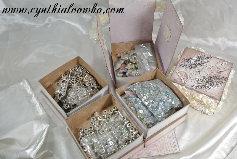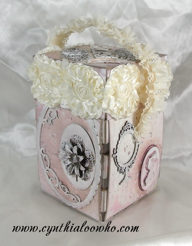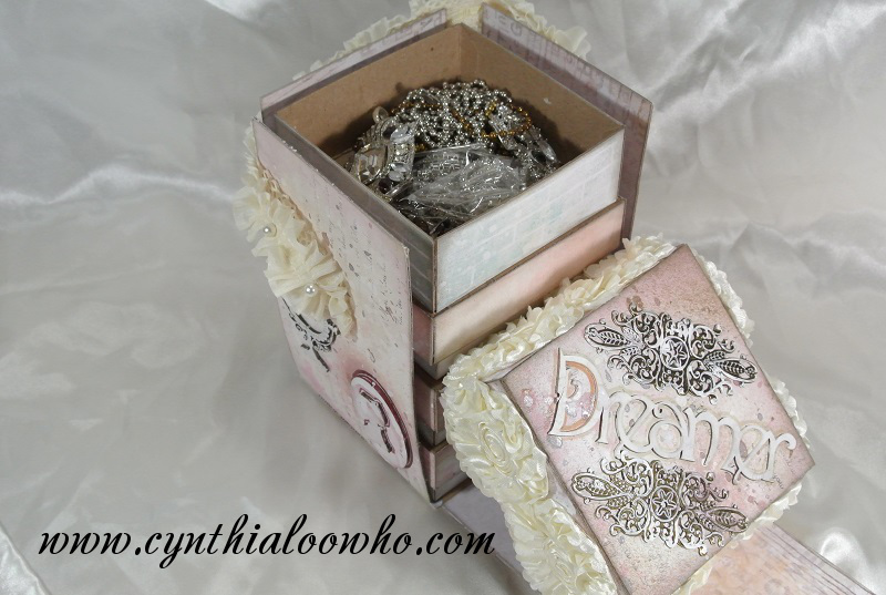 Here is a stacked box I made from chipboard. It has 4 different boxes for storage. I made a tutorial for this box, if you’d like to see it check the video below. I used some beautiful papers from 7 Dots Studio “Messy Head” collection. My beautiful Bodacious Blush Starburst spray from Lindy’s Stamp Gang and Frozen Jack Frost spray. I distressed all the edges with Pumice Stone distress ink. Then I added some beautiful chipboard pieces from Fab Scraps, Imaginarium Designs, and Wow. I painted them white and distressed with the Pumice Stone distress ink. I also used some beautiful filigrees from Elegant Embellishments and laces/trims from One Little Dreamer, and Suhafuha‘s zibbet store. This box measures 7 inches tall and 4 1/4 inches wide and deep.
