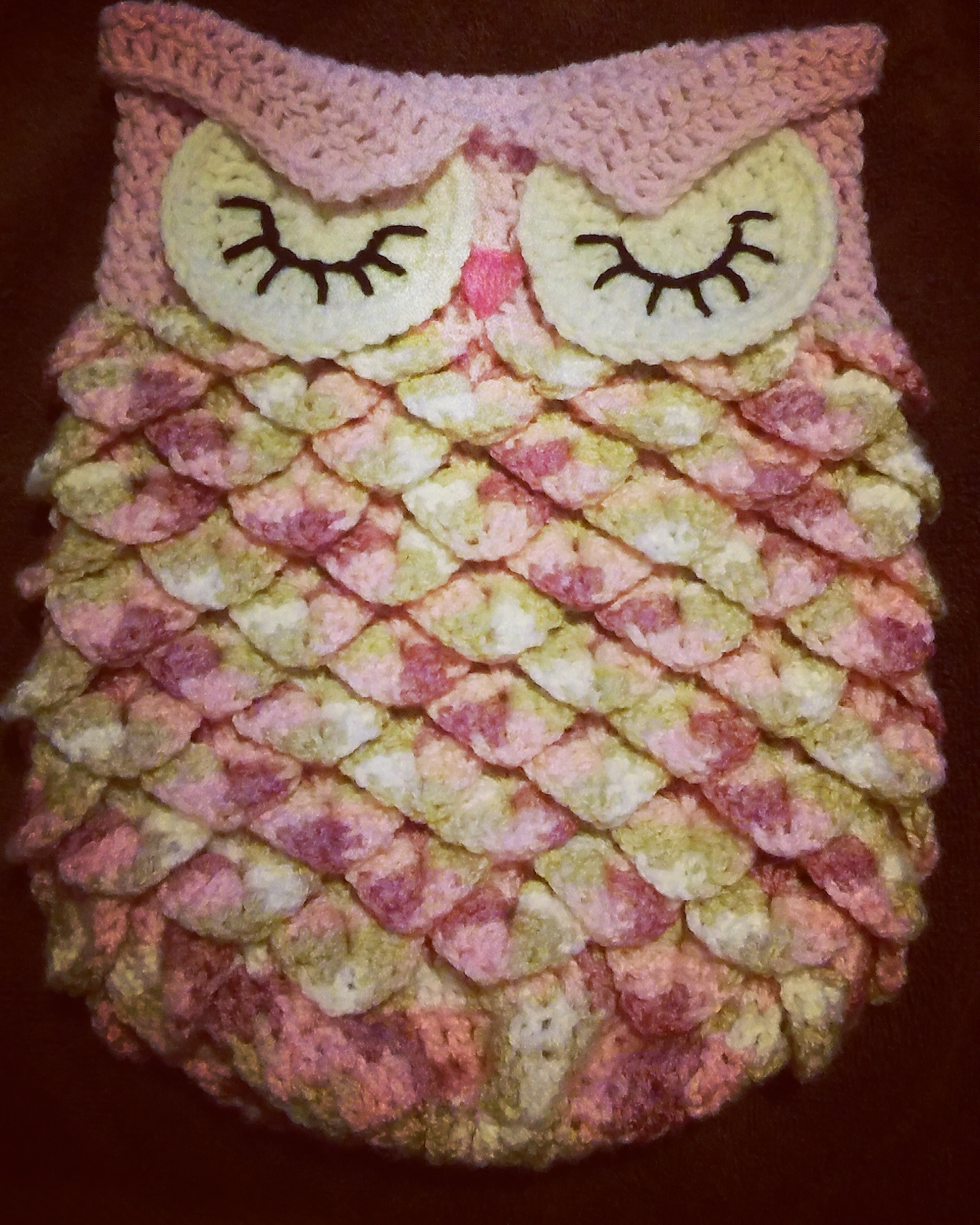 I was tagged in a couple posts on Facebook of owl cocoons so I decided to try making one. I searched and searched and I couldn’t find one. I remembered making a crocodile stitch purse last year so I merged that with my own idea. This is how it turned out. I’m pretty happy with it. It took many hours. I didn’t sleep last night and I knew if I laid down I would be thinking about it anyway. I’m going to sleep now. Night night. Wish I had a warm cozy owl cocoon to snuggle in.